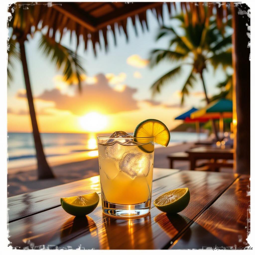 Bildquelle: Das Bild wurde mit KI erstellt. https://creator.nightcafe.studio/ „A Caipiroska cocktail on a wooden table at a vibrant beach bar in Brazil, circa 1990. The drink is garnished with lime wedges and ice, with the warm glow of a setting sun casting long shadows. In the background, lush palm trees and hints of colourful beach umbrellas. A nostalgic, vintage photograph aesthetic with saturated colours and a slight film grain, emulating the style of Slim Aarons and Peter Beard. Soft ambient lighting, golden hour hues, high resolution.“