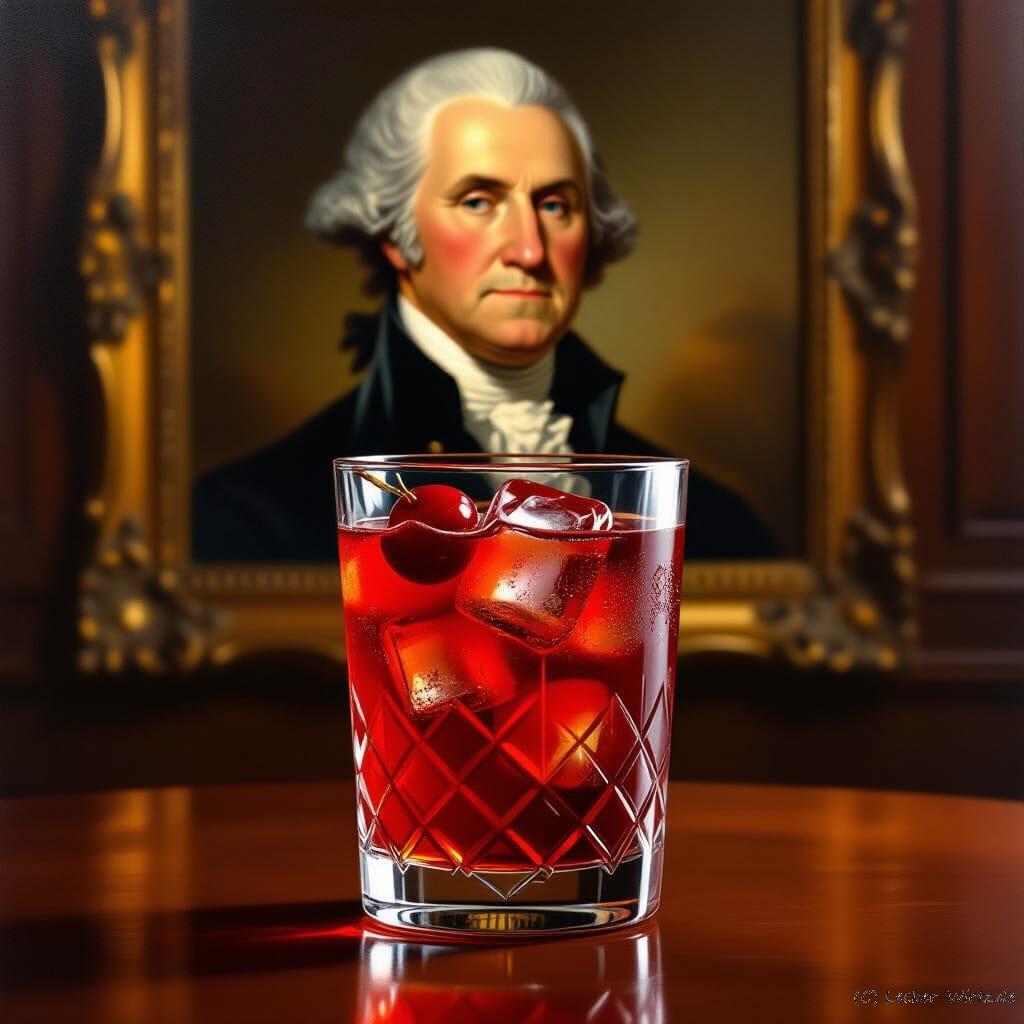 Bildquelle: Das Bild wurde mit KI erstellt. https://creator.nightcafe.studio/ „A glass of bright red Cherry Bounce cocktail, with condensation on the glass, sits on a polished wooden table. In the soft, unsharp background, a stoic portrait of George Washington is visible, perhaps on a wall hanging or as part of a mural. The lighting is warm and atmospheric, casting a gentle glow on the cocktail. This scene is rendered in a realistic oil painting style, with subtle textures and rich colors, evoking the american colonial era, in the style of Charles Willson Peale and Gilbert Stuart.“