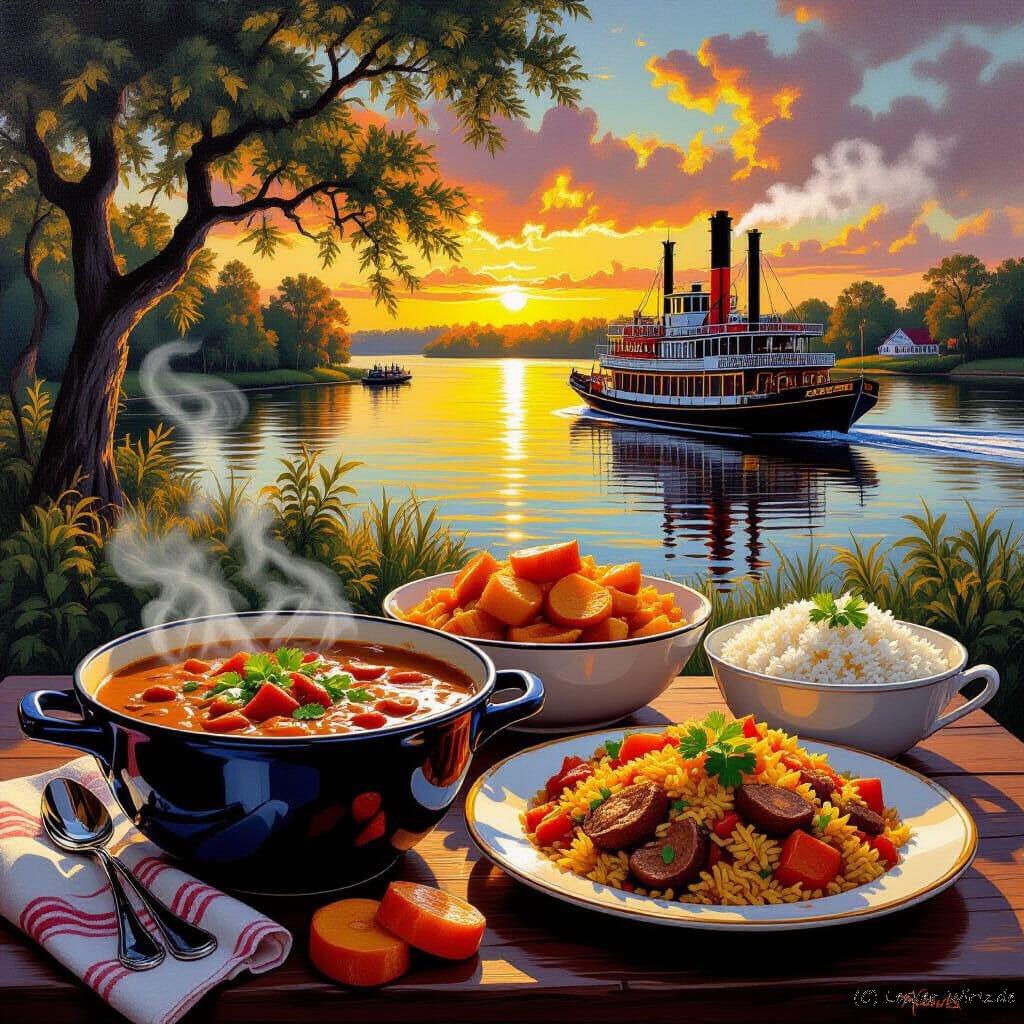 KI-Bils Prompt: “A vibrant and detailed still-life painting showcasing the rich colors and textures of Cajun and Creole cuisine. In the foreground, a steaming bowl of gumbo sits next to a platter of jambalaya. To the side, candied yams and dirty rice are arranged artfully. The scene is illuminated by warm, dramatic lighting, casting deep shadows and highlighting the succulent details of the food. In the background the Mississippi and a steamboat”