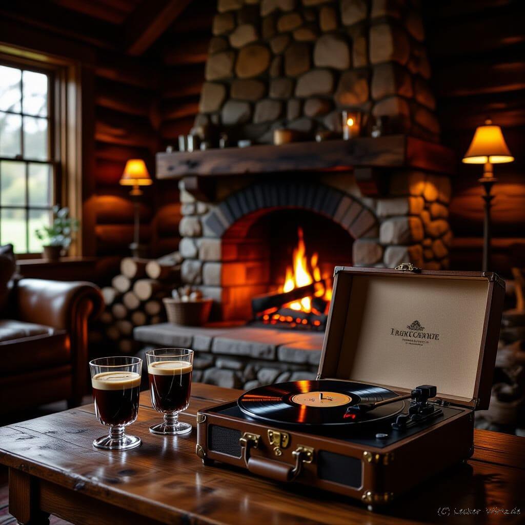 Bildquelle: Das Bild wurde mit KI erstellt. https://creator.nightcafe.studio/ „A cozy, rustic wooden lodge room interior, featuring a stone chimney with a warm fire crackling inside. Two glasses of rich chocolate liqueur sit on a wooden table. An antique record player is in the foreground, its needle resting on the final groove of a vinyl record. The room is bathed in dim, moody lighting, with soft golden light emanating from the fireplace and a single lamp, creating long shadows and an intimate atmosphere. The style is akin to a Dutch Golden Age painting, emphasizing chiaroscuro and rich textures, reminiscent of Rembrandt and Vermeer, with a touch of warmth and inviting ambiance.”