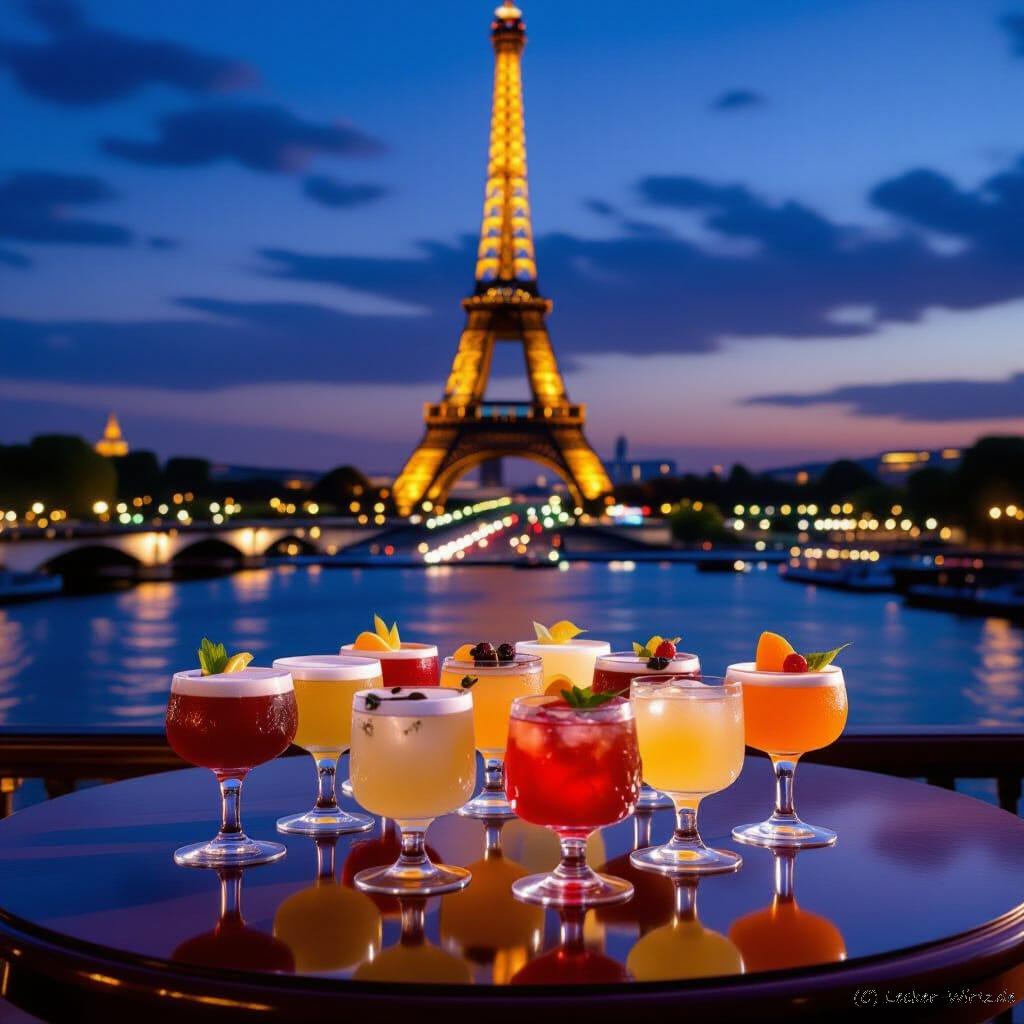 Prompt: “A lavish spread of twelve exquisitely crafted French cocktails artfully arranged on a polished mahogany table. In the background, the iconic Eiffel Tower soars majestically against a twilight sky, its lights beginning to twinkle. The Seine River flows serenely in the foreground, reflecting the city’s warm glow. The scene is bathed in soft, ambient light, emphasizing the vibrant colors and delicate garnishes of each drink. Rendered in a photorealistic style with a shallow depth of field, capturing fine details and a sense of sophisticated ambiance, inspired by the cinematic photography of Annie Leibovitz and the moody lighting of Edward Hopper.”
