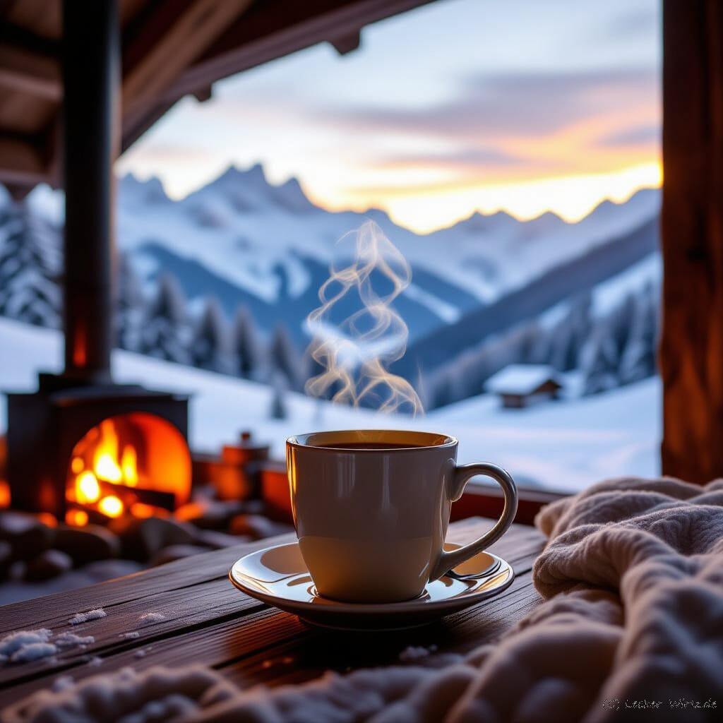 Bildquelle: Das Bild wurde mit KI erstellt. https://creator.nightcafe.studio/ „A steaming mug of Jagertee in a cozy Skihütte deep in the Austrian Alps. Warm, inviting light spills from a crackling fireplace, illuminating the rich, amber hue of the drink and soft wooden textures of the hut. Snow-covered peaks are visible through a window. The scene is rendered in a detailed, atmospheric style, with painterly textures reminiscent of the landscapes of Caspar David Friedrich and the rustic charm of the Expressionist paintings by Erich Heckel. Golden hour light bathes the scene, creating a warm, inviting glow.”