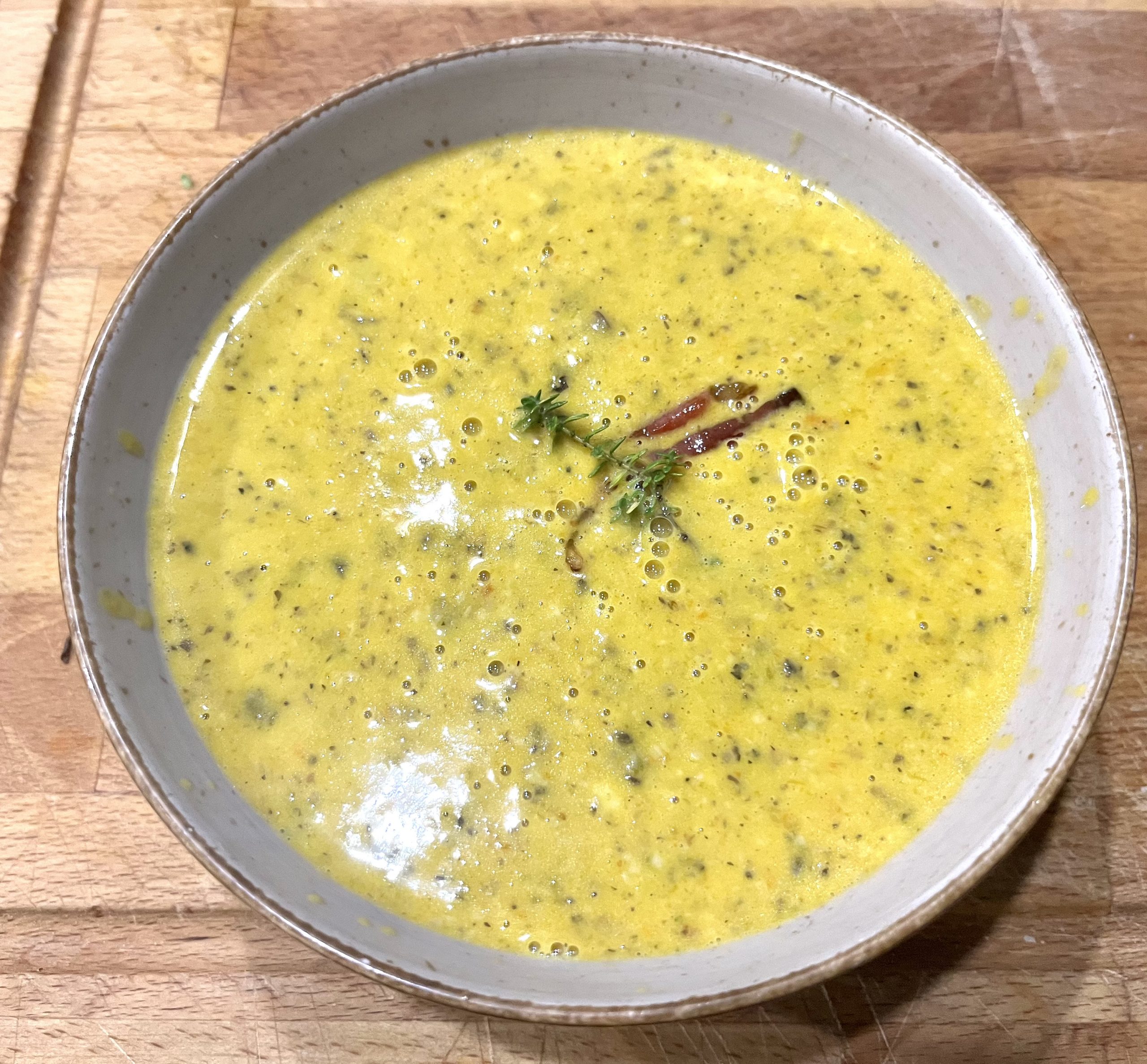 Mit Gemüsebrühe ablöschen und zerdrückten Knoblauch, die Kastanien sowie das Lorbeerblatt hinzugeben. Wenn Du ein Stück Parmesanrinde hast, kannst Du es mit hinzugeben. Anschließend 10 min köcheln lassen, das Lorbeerblatt (und die Parmesanrinde) entfernen und mit dem Stabmixer alles pürieren.