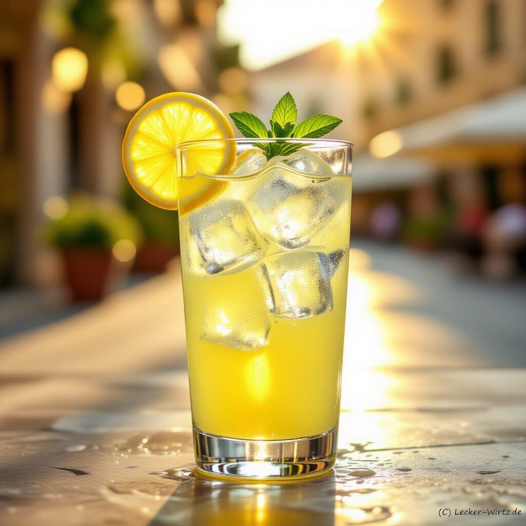 Bildquelle: Das Bild wurde mit KI erstellt. https://creator.nightcafe.studio/ „A vibrant, refreshing Limoncello Spritz served in a tall, elegant glass filled with ice cubes and garnished with a lemon slice and a fresh mint sprig. The drink is bubbly and translucent, with a bright yellow-green hue. Sunlight streams through the glass, illuminating the effervescence. Captured in a photorealistic style, with shallow depth of field and a bokeh background of a sunny Italian piazza. Shot with a macro lens, highlighting the condensation on the glass and the delicate bubbles.”