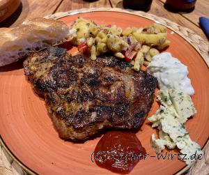 Zu den marinierten Nackenkoteletts gibt es einen Kartoffelsalat und ein kühles Bier.