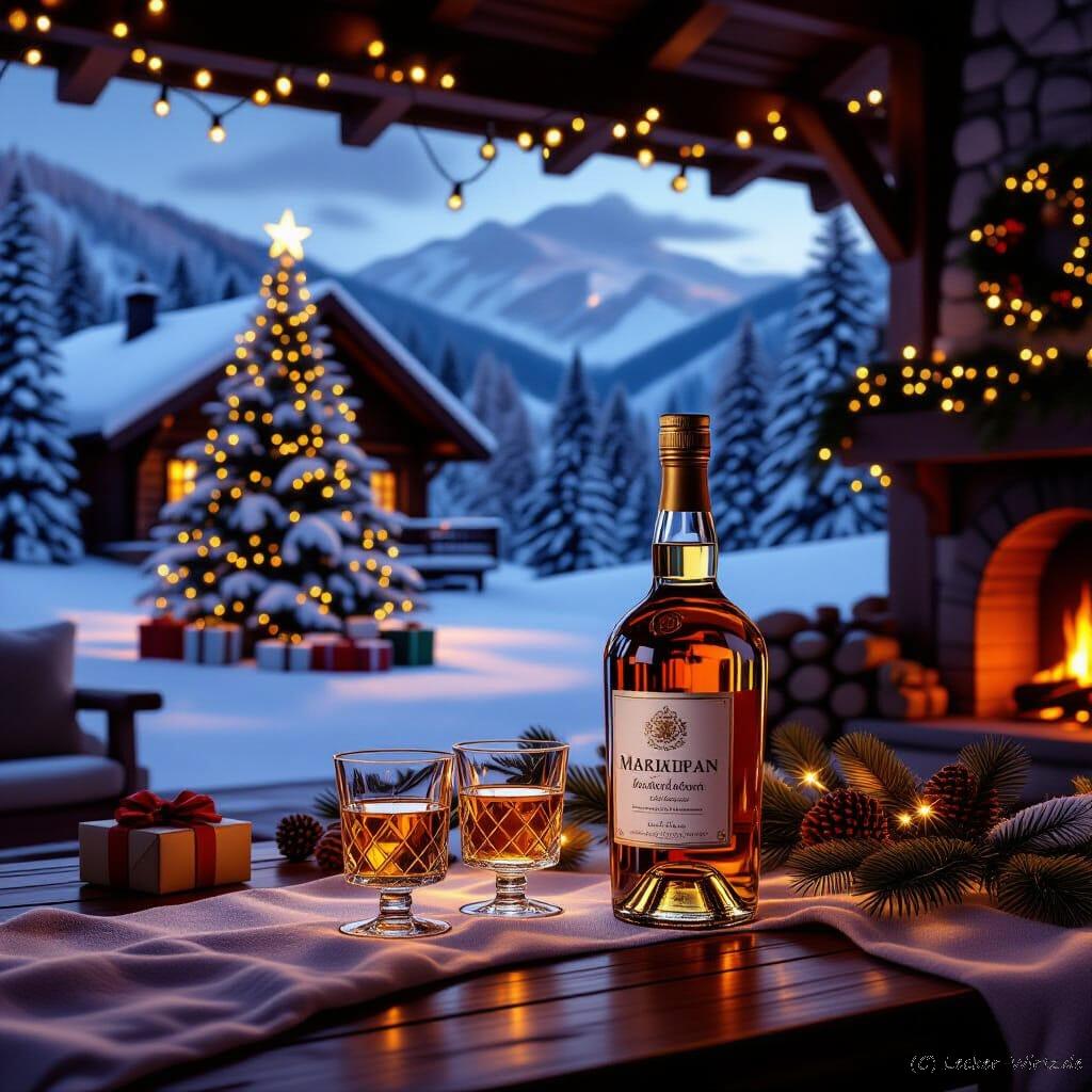 Bildquelle: Das Bild wurde mit KI erstellt. https://creator.nightcafe.studio/ „A self-decorated bottle without a label, and two small liqueur glasses of homemade Marzipanlikör on a table in a cozy wooden lodge. The lodge is in snowy hills, decorated for Christmas with a Christmas tree and presents in front of it. The scene is illuminated by soft, warm Christmas lights and the gentle glow of a fireplace, casting a cozy ambiance. Rendered in a detailed, rich oil painting style with a slightly muted, warm color palette, reminiscent of the holiday-themed works of Thomas Kinkade and Bob Ross. Emphasis on texture and ambient lighting.”