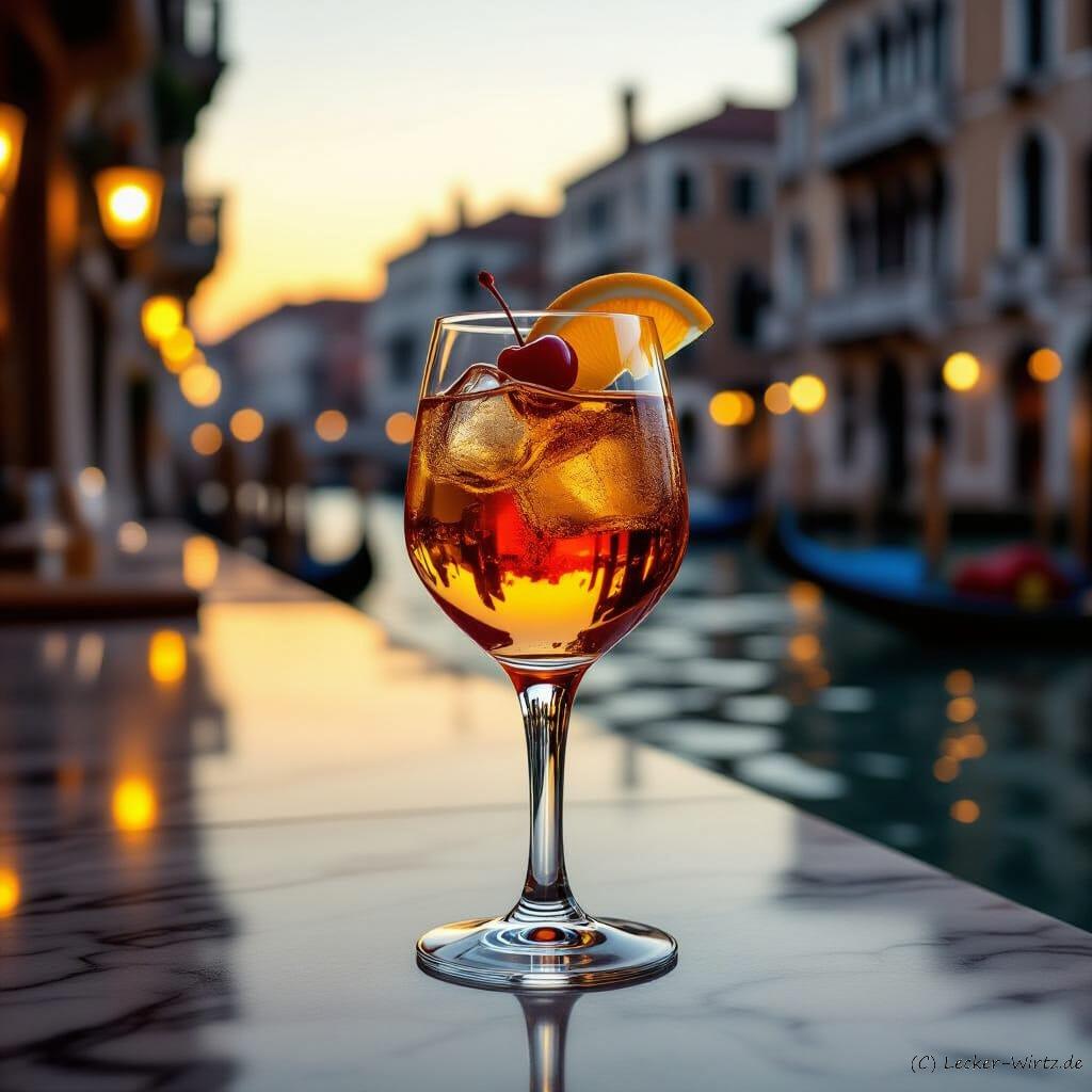 Bildquelle: Das Bild wurde mit KI erstellt. https://creator.nightcafe.studio/ „An elegant, tall glass filled with the Ve.N.To liqueur, garnished with a fresh orange slice and a single cherry, sitting on a polished marble bar counter in a dimly lit Venetian bacaro during golden hour. Soft, warm light catches the condensation on the glass, highlighting the amber hue of the drink. In the background, blurred reflections of classic Venetian architecture and canal lights add depth. Photorealistic style, shot with a shallow depth of field, 85mm lens, offering exquisite detail and a subtle bokeh effect.”