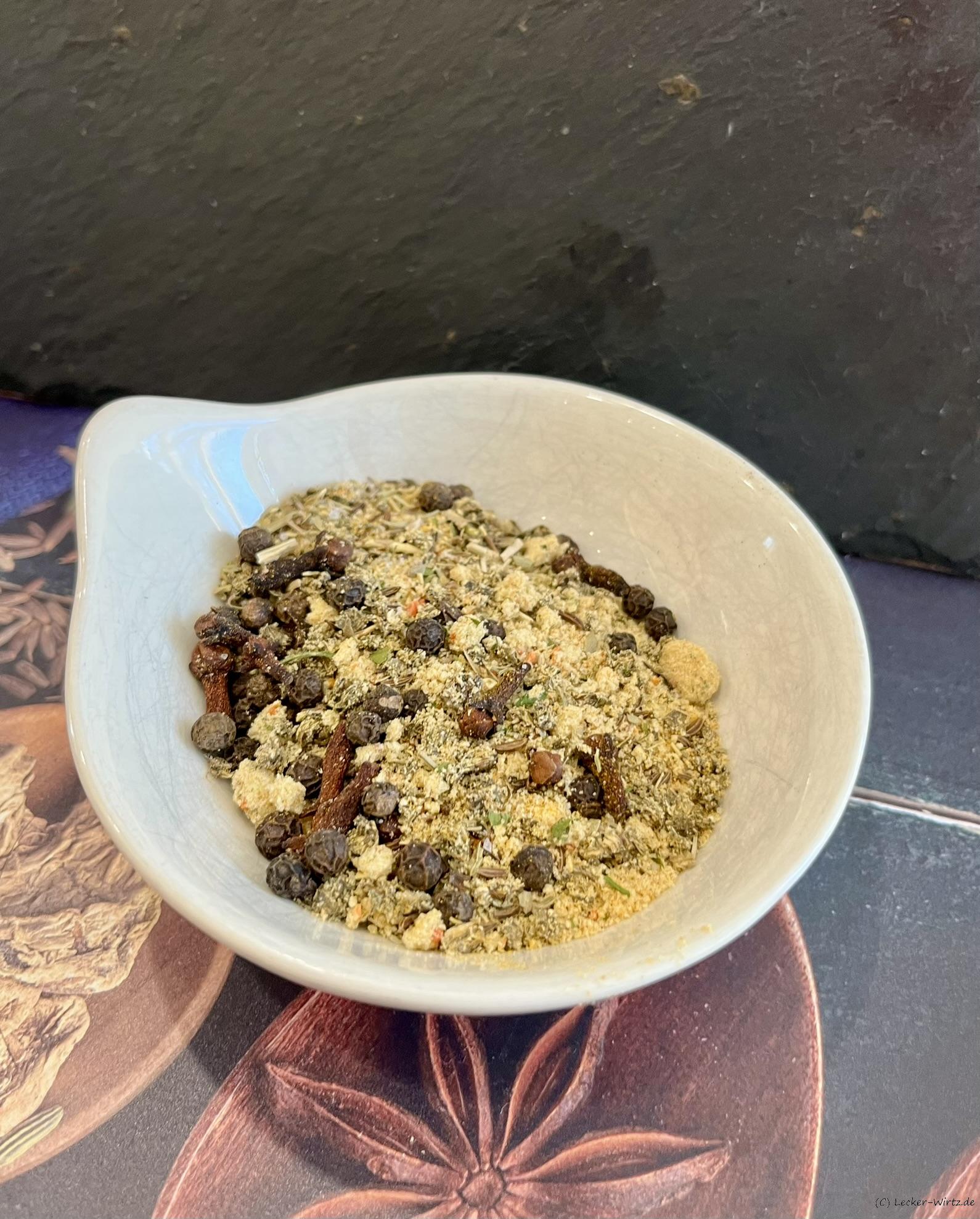 Die Gewürzmischung “Gans lecker” enthält z. B.: getrocknetes Gemüsepulver, Pfefferkörner, Kümmel, Beifuß, Kurkuma, Bohnenkraut, Zimt, Lorbeerblätter, Wacholderbeeren.