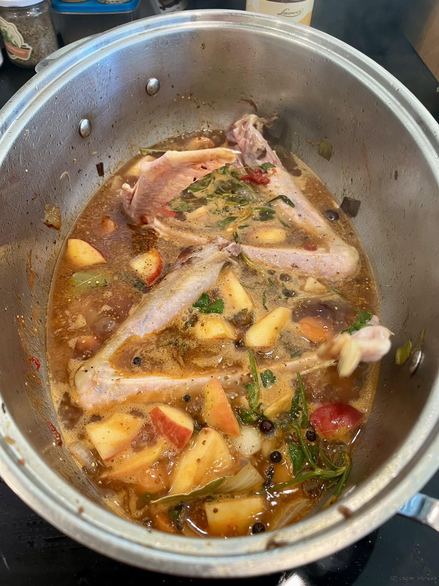 Den Rest vom Wein und die Geflügelbrühe hinzugießen, kurz aufkochen lassen und die Hitze reduzieren.