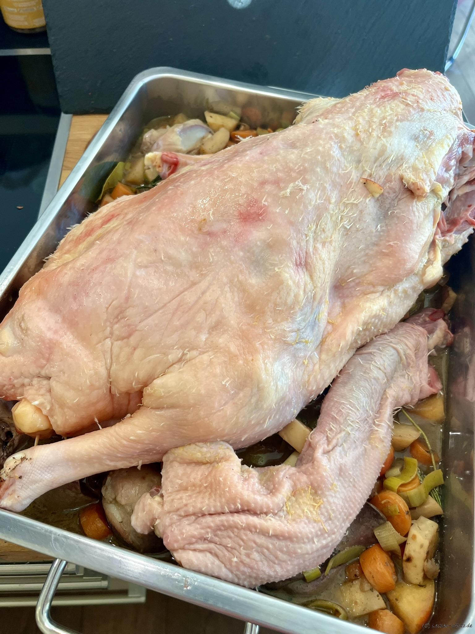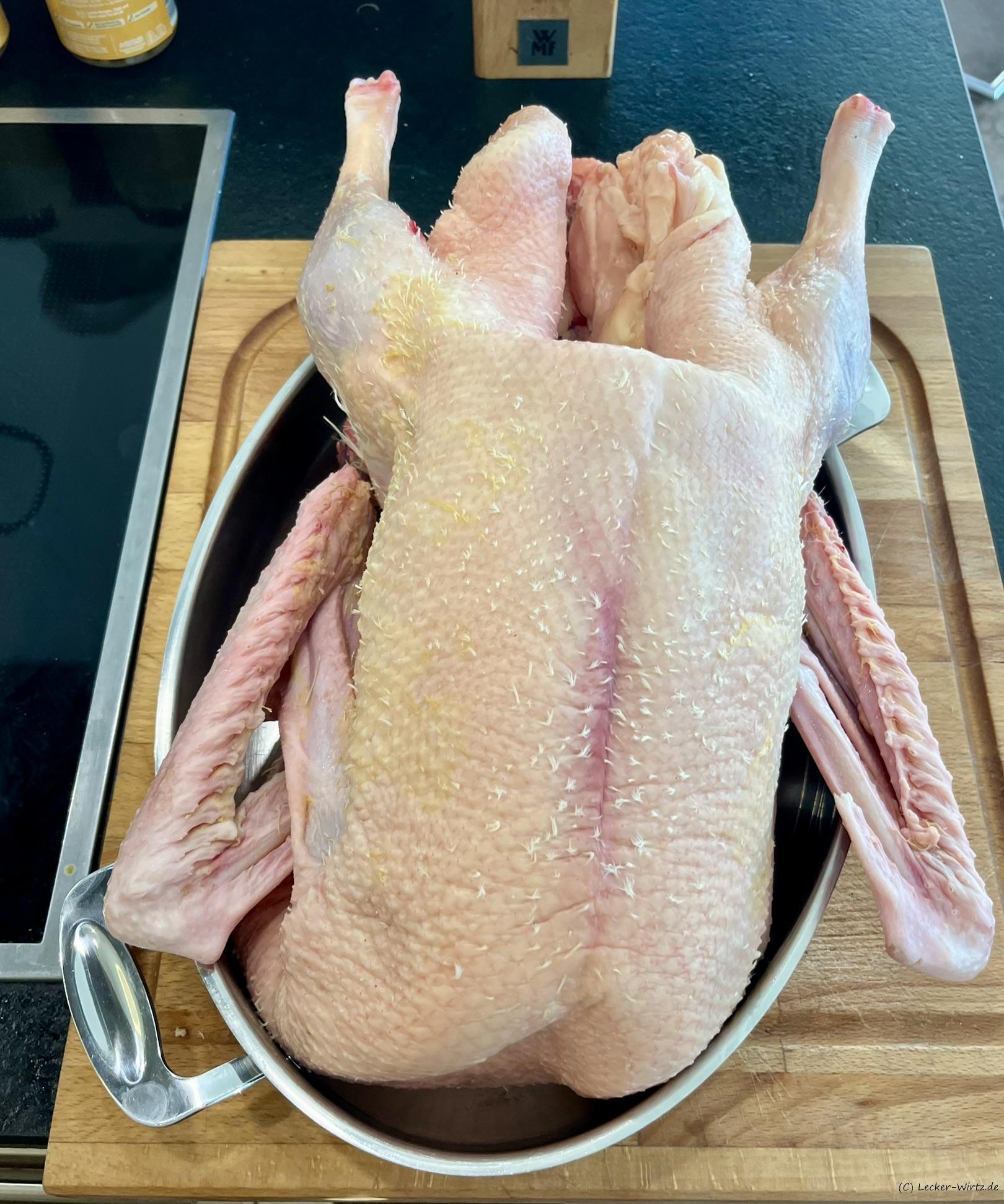 Schon am Vortag schwante mir, dass ich bei der Vorbestellung der Gans die Größe nicht nachgefragt hatte und es eventuell zu einem Konflikt mit unserem Bräter kommen würde.