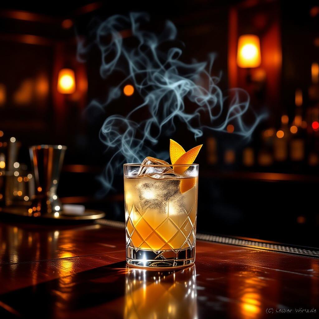Bildquelle: Das Bild wurde mit KI erstellt. https://creator.nightcafe.studio/ „A polished mahogany bar in a dimly lit 1930s speakeasy, adorned with art deco details, displays a Gin and Sin cocktail. Faint cigarette smoke hangs in the air, creating a noir, gangster aesthetic. The cocktail glass catches low, golden light, casting intriguing shadows. Rendered in a dramatic chiaroscuro lighting style, with rich, saturated colors evoking the era, inspired by the works of Edward Hopper and Tamara de Lempicka.“