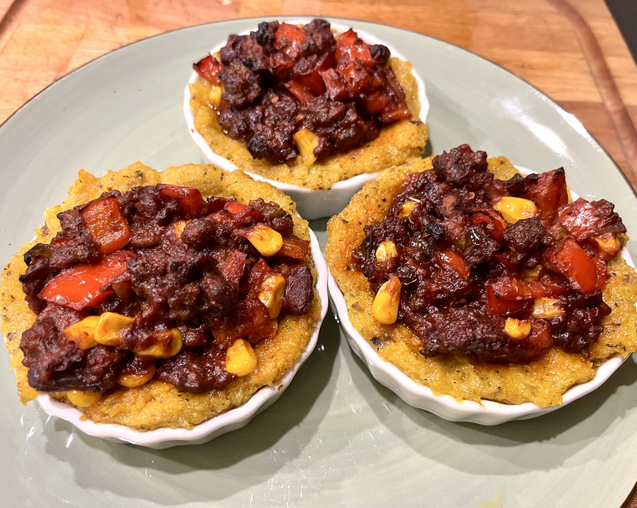 Beim nächsten Mal werde ich noch Koriander an die Kürbis-Polenta machen und die Tartelettes mit etwas Käse überbacken. Die Mengenangaben sind ca. Angaben, da ich die Chili con Carne Grundlagen von einer andern Portion abgezweigt habe. Auch die Kürbis-Polenta hatte ich noch vom Vortag übrig und beides als „Resteverwertung“ kombiniert.