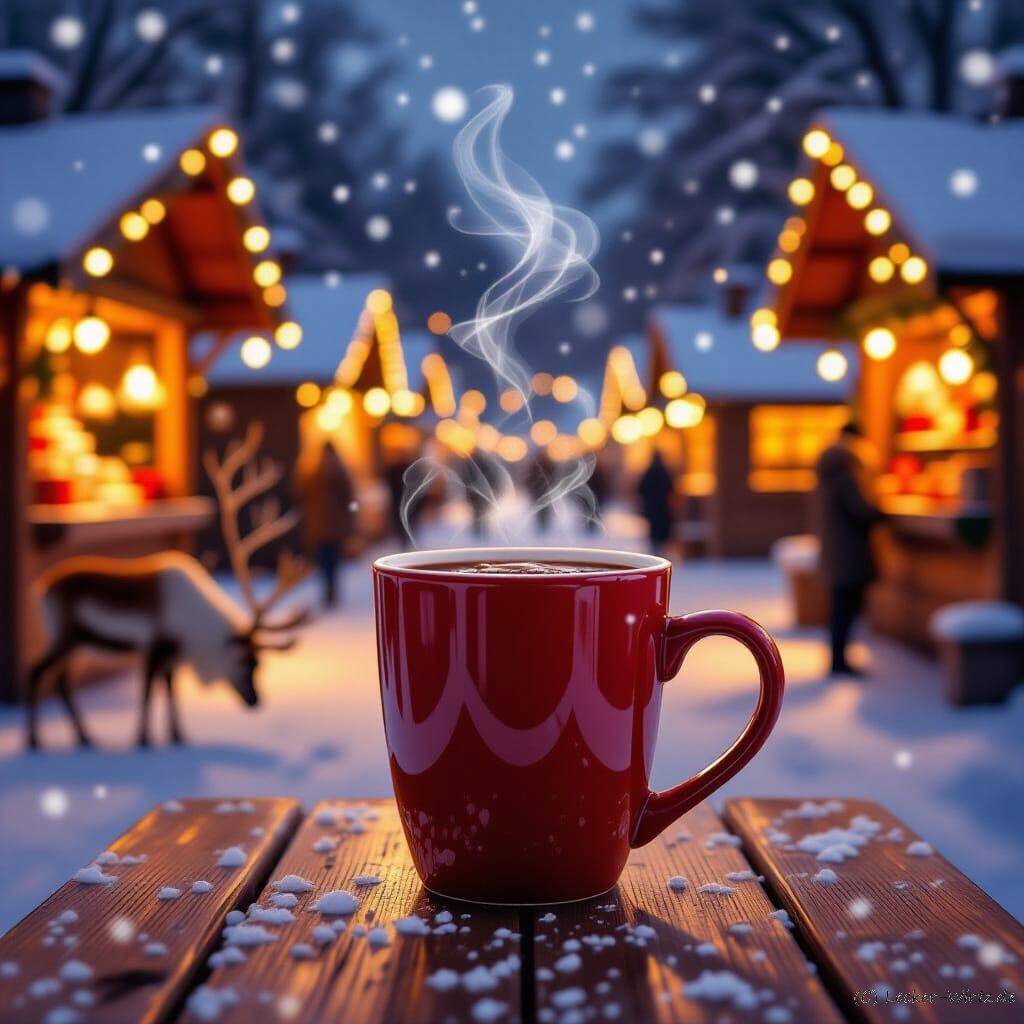 Bildquelle: Das Bild wurde mit KI erstellt. https://creator.nightcafe.studio/ „A steaming mug of red wine punch sits on a rustic wooden table at a bustling Christmas market in Finland, with reindeer grazing nearby and delicate snowflakes falling. Vibrant stalls glow with warm, inviting golden light, casting a gentle, cozy ambiance. Detailed illustration with soft, painterly textures, rendered in a realistic style, focus on atmosphere. The golden light illuminates the falling snow.“
