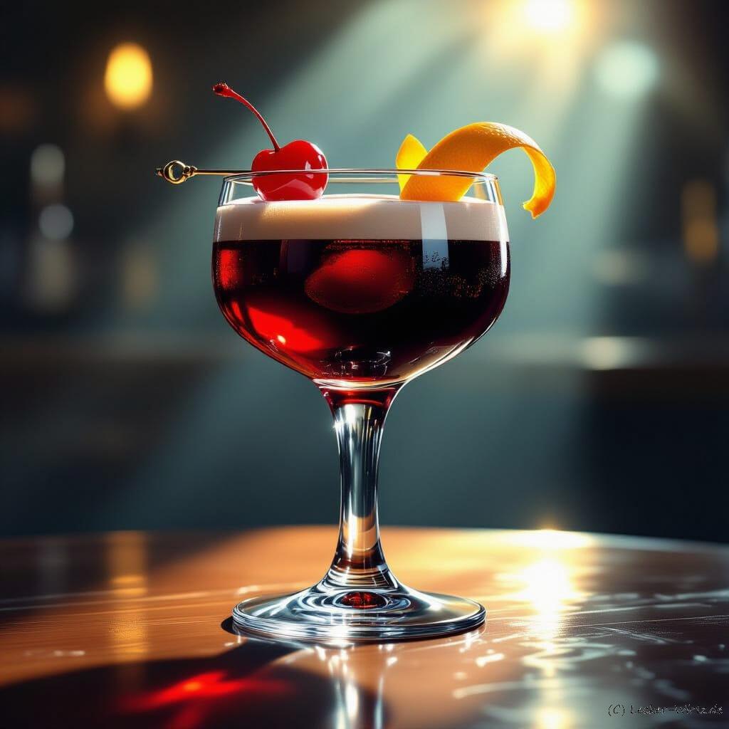 Bildquelle: Das Bild wurde mit KI erstellt. https://creator.nightcafe.studio/ „A New York Sour cocktail in a clear glass, with a layer of tart sour mix at the bottom and a layer of deep red wine floating on top. The drink is garnished with a maraschino cherry and an orange peel. The lighting is dim and moody, with a single spotlight illuminating the glass, creating dramatic shadows. The scene is rendered in a hyperrealistic digital painting style, with an emphasis on extreme detail and vibrant colors, in realistic atmosphere. The rich colors and reflective surfaces create a sophisticated and inviting atmosphere.“