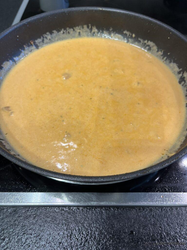 Ich lasse die abgelöschten Zutaten um die Hälfte reduzieren, bevor ich die Sahne und den Frischkäse dazugebe.