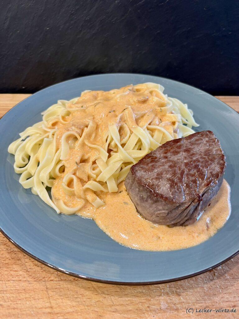 Die Parmesan-Frischkäse Sauce passt auch sehr gut zu Steaks mit Tagliatelle.