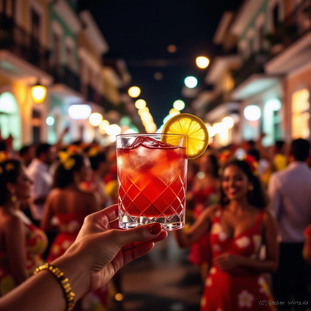 Bildquelle: Das Bild wurde mit KI erstellt. https://creator.nightcafe.studio/ „A vibrant Rabo de Galo cocktail, prominently displaying Cachaca and red Vermouth, garnished with a delicate lemon zest, is held aloft amidst a street celebration during the 1959 Carnival in Sao Paulo. The scene is alive with exuberant energy, with Samba dancers and a typical Rio de Janeiro feeling. Warm, lively, volumetric lighting washes over the jubilant atmosphere, evoking a sense of nostalgic gaiety. Photorealistic, shot with a vintage 35mm lens, subtle film grain, shallow depth of field, high detail, vibrant color saturation.“