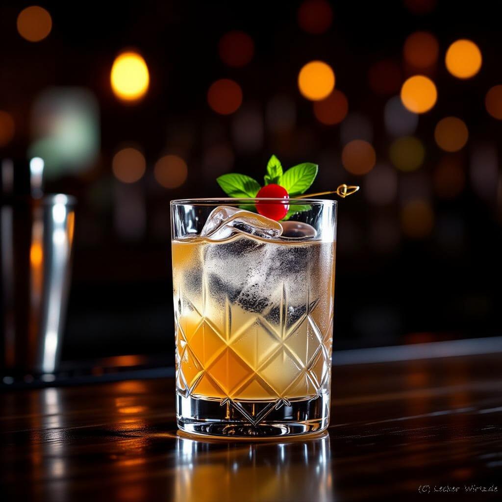 Bildquelle: Das Bild wurde mit KI erstellt. https://creator.nightcafe.studio/ „A stylish cocktail glass filled with a gin, maraschino liqueur, and elderflower liqueur concoction, meticulously prepared. The scene is set in a dimly lit, sophisticated bar in Seattle around the year 2000, with a subtle bokeh effect in the background. The lighting is moody and atmospheric, with a touch of neon glow from outside reflecting on the glass. Rendered in a photorealistic style, capturing the rich colors and textures of the drink, with shallow depth of field and a subtle film grain effect.“