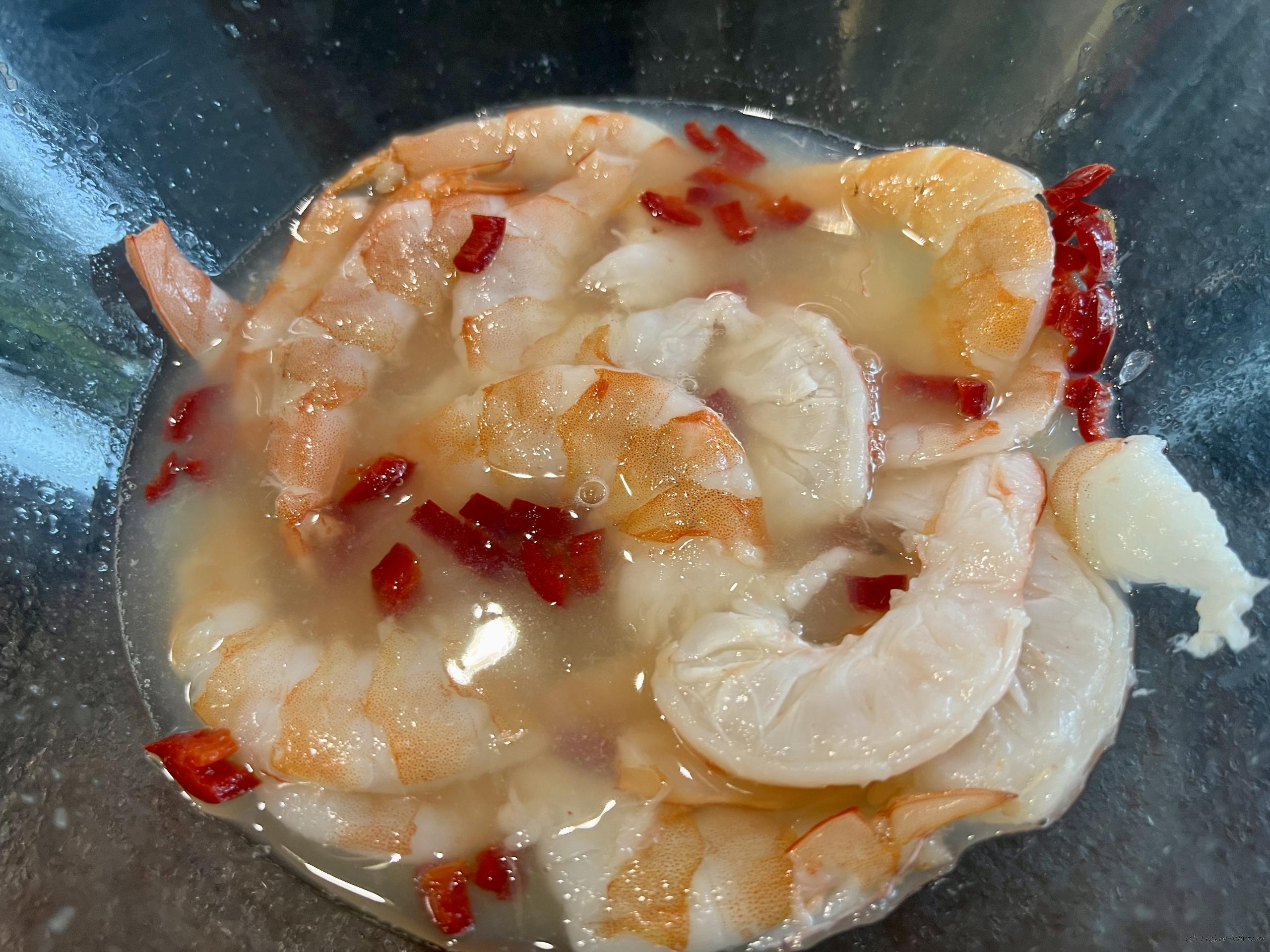 Für die Shrimps-Ceviche legst Du am Vortag die Shrimps oder Scampi in Zitronensaft. Die Säure und das Eiweiß der Krustentiere reagieren miteiander und das Eiweiß gerinnt, wie beim Kochprozess. Eine sehr lecker Art Scampi und Shrimps zuzubereiten.