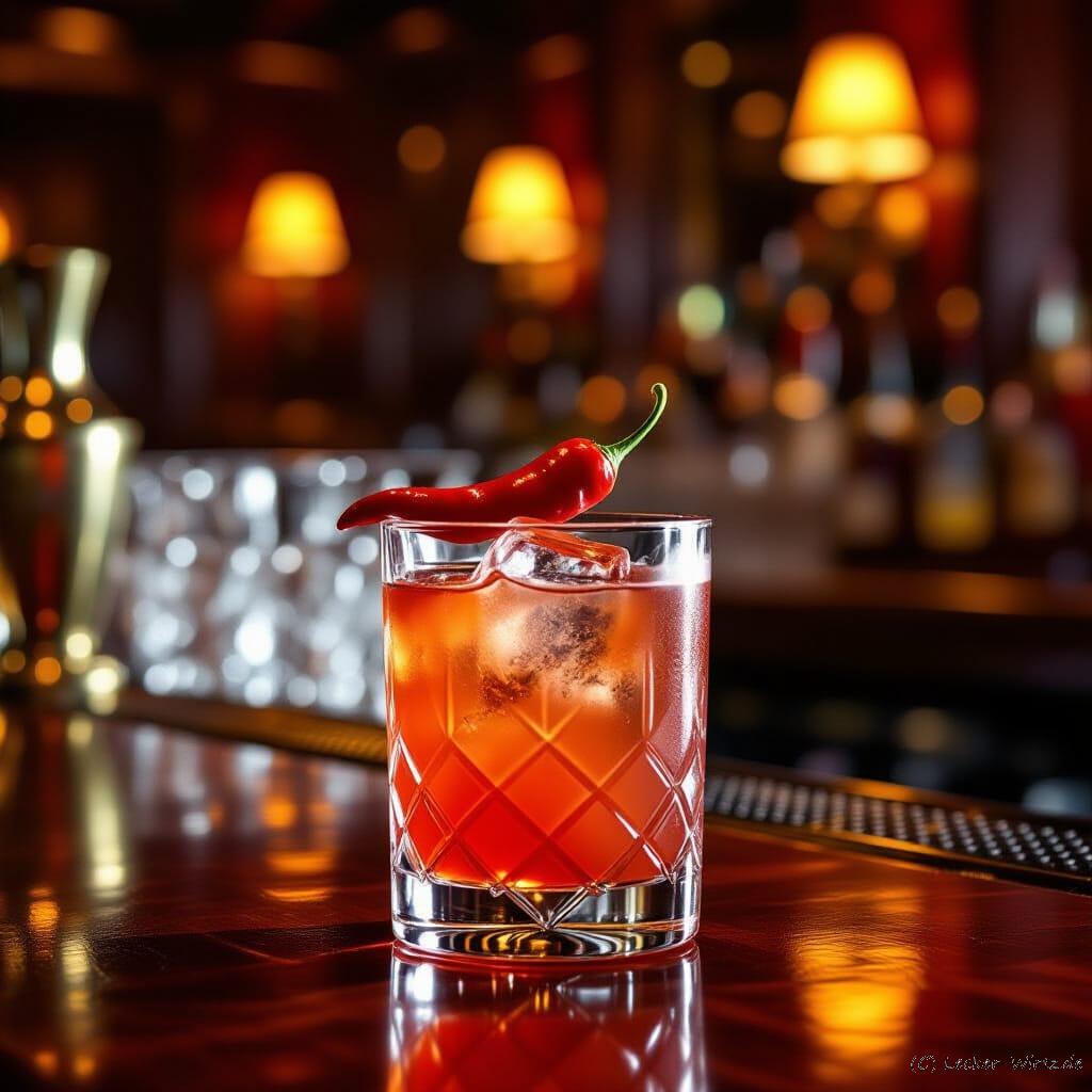 Bildquelle: Das Bild wurde mit KI erstellt. https://creator.nightcafe.studio/ „A Spicy Fifty cocktail garnished with a bright red chili pepper, elegantly presented on a polished mahogany bar at Salvatore at Fifty, located within the opulent Fifty Casino on 50 St James’s Street, London. The scene is bathed in the warm, golden glow of ambient lighting, with subtle reflections glinting off the glassware and the rich wood textures. Rendered in a photorealistic style, with a shallow depth of field, emphasizing the exquisite detail of the drink and its surroundings, evoking a sense of luxury and sophistication. Shot with a prime lens, 85mm f/1.4, high resolution, incredibly detailed.“