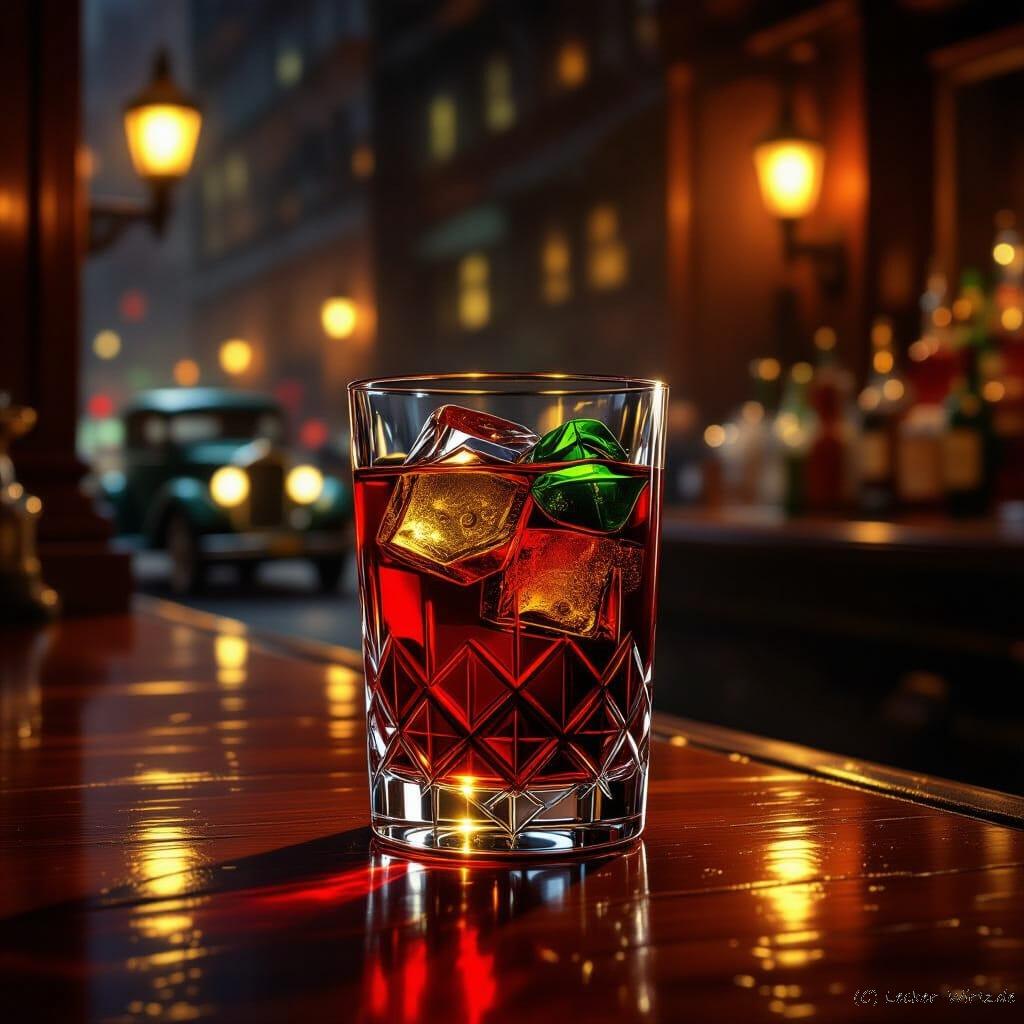 Bildquelle: Das Bild wurde mit KI erstellt. https://creator.nightcafe.studio/ „A glass of Tipperary cocktail, glowing with the rich ruby hues of red vermouth and the vibrant emerald of green Chartreuse, sits on a polished mahogany bar. Soft, warm gaslight illuminates the scene, casting long shadows across the polished wood and glinting off the crystal glass. In the background, out of focus, hints of a bustling New York street circa 1912 – early automobiles and flickering electric signs. Rendered in a highly detailed, realistic oil painting style, influenced by the moody, atmospheric light of Edward Hopper and the rich detailing of John Singer Sargent. Vivid color and dynamic lighting enhance the vintage atmosphere.“