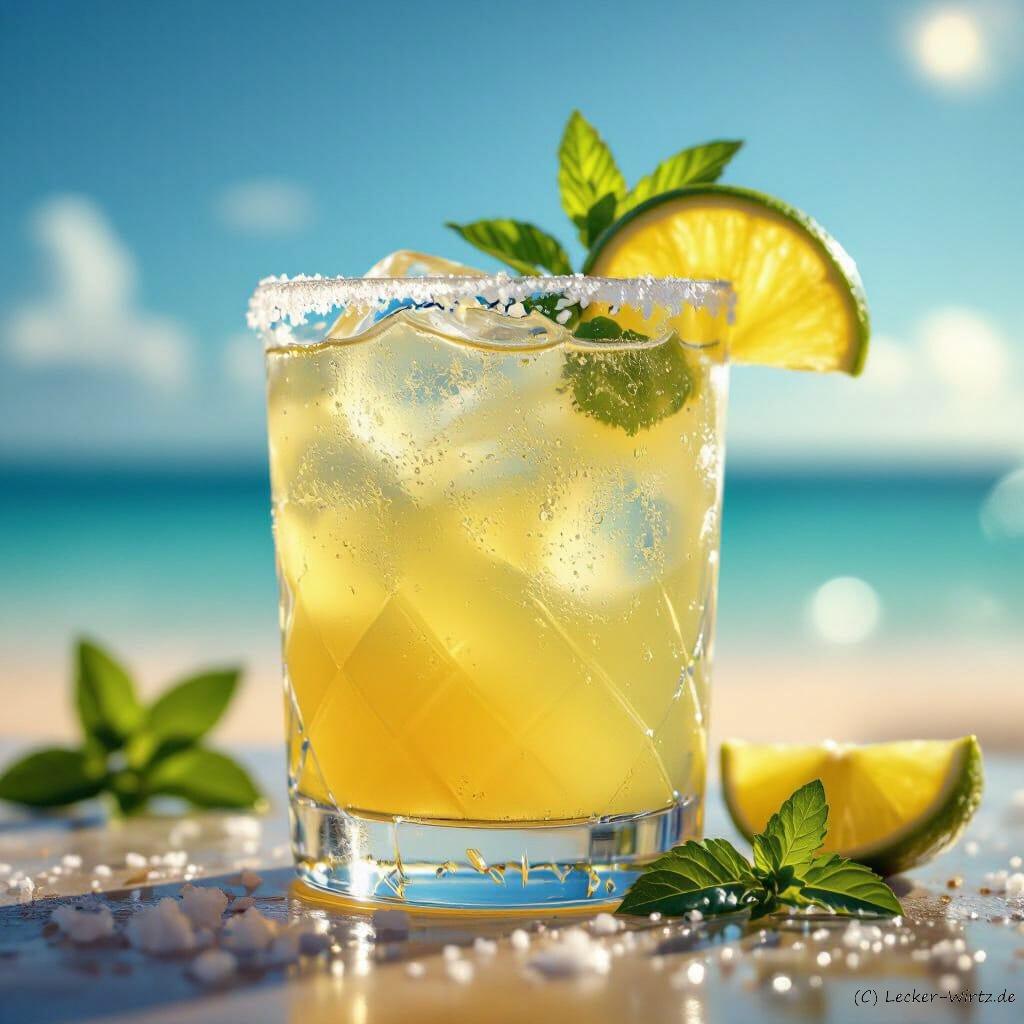 Bildquelle: Das Bild wurde mit KI erstellt. https://creator.nightcafe.studio/ „A vibrant Virgin Margarita mocktail served in a salt-rimmed margarita glass. The drink is a refreshing blend of lime juice, agave nectar, and sparkling water, garnished with a fresh lime wedge and a sprig of mint. The background is a soft-focus, sun-drenched beach scene. The image is rendered in a photorealistic style with sharp focus on the drink, showcasing detailed condensation on the glass and the texture of the salt rim, with a shallow depth of field and warm, inviting lighting. Shot with a macro lens, 8K resolution.“