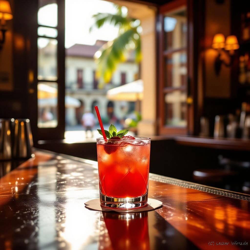 Bildquelle: Das Bild wurde mit KI erstellt. https://creator.nightcafe.studio/ „A vibrant Virgin Strawberry Daiquiri rests on the polished mahogany bar of ‚El Floridita‘ in Havana. Sunlight streams through the open window, illuminating the condensation on the glass and the ruby-red hue of the drink. The atmosphere is alive with the murmur of conversations and the distant strumming of a guitar. In the background, classic Cuban architecture and the gentle sway of palm trees are visible. The scene evokes a sense of tropical leisure and classic elegance. Shot with a shallow depth of field, using a 50mm lens, capturing the drink in exquisite detail under warm, natural lighting. Photorealistic, 8k resolution.!